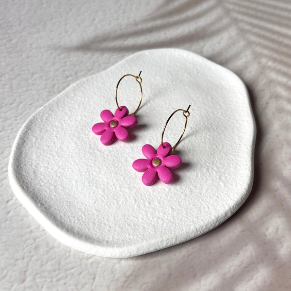 Orecchini a cerchietto Arielle Velvet in acciaio placcato oro 18k (diametro 2 cm) con charm floreale in argilla polimerica, realizzati interamente a mano in Italia. Ipoallergenici e nickel free, combinano...