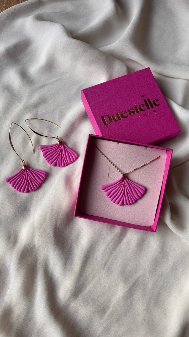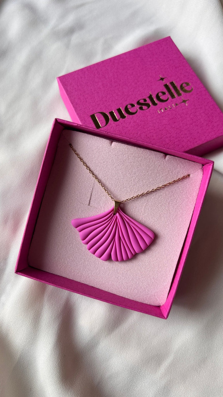 Un tributo alla bellezza senza tempo della natura: la collana Ginkgo Rosa richiama l’eleganza della foglia di ginkgo in una versione moderna e colorata. Il pendente rosa in argilla polimerica, abbinato a una catena dorata sottile, aggiunge un tocco raffinato ma audace. Perfetta da sola o in set con gli orecchini coordinati.